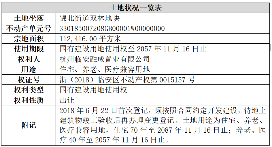 根据管理人向杭州市自然资源和规划局调取的资料显示,融成公司名下的国有建设用地使用权坐落于锦北街道双林B-06-12地块,平面届止为(四至范围)东至空地、南至大学路、西至林地、北至林地,出让宗地的用途为住宅、养老、医疗兼容。根据原土地使用权证显示,该地块具体情况如下: