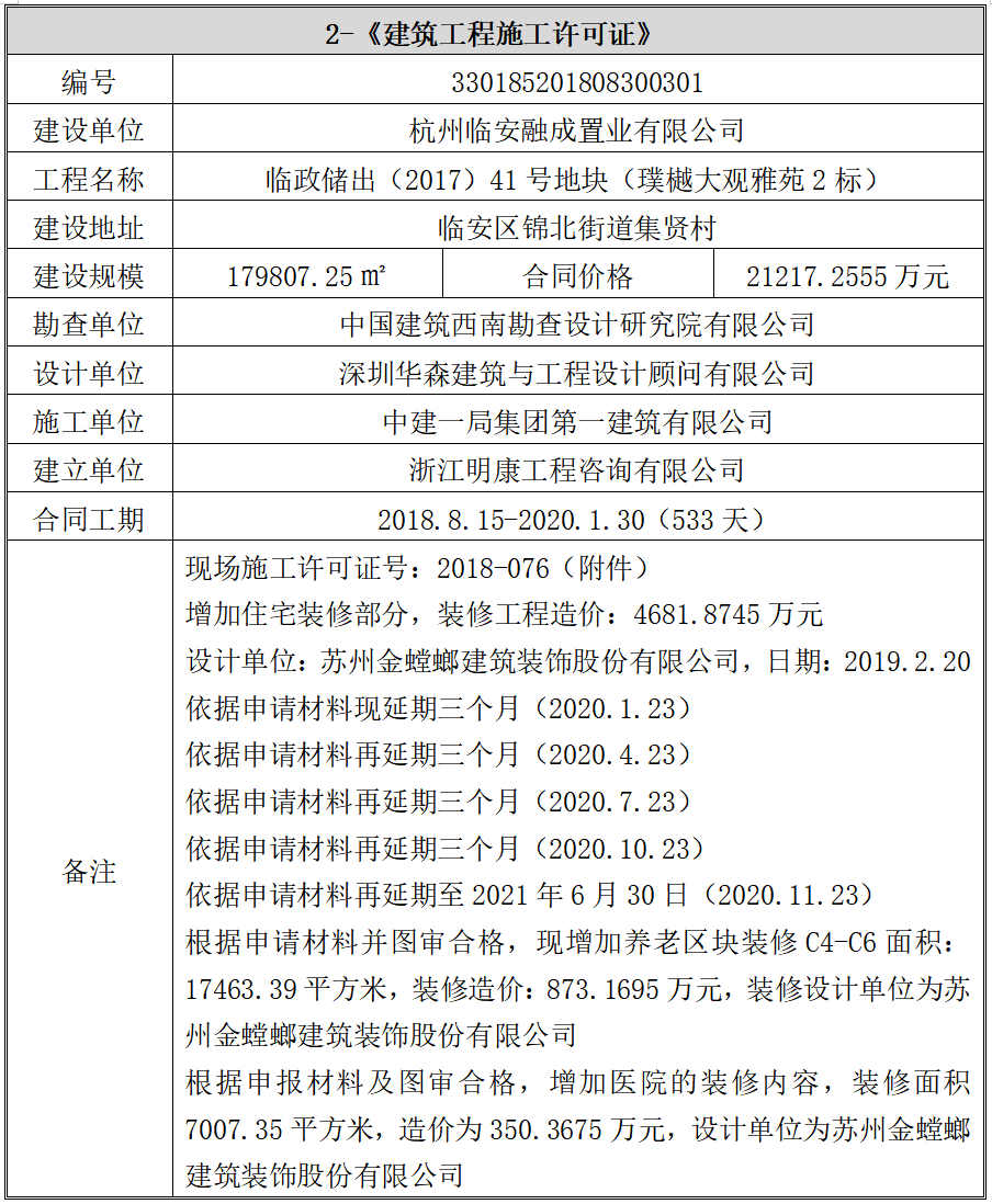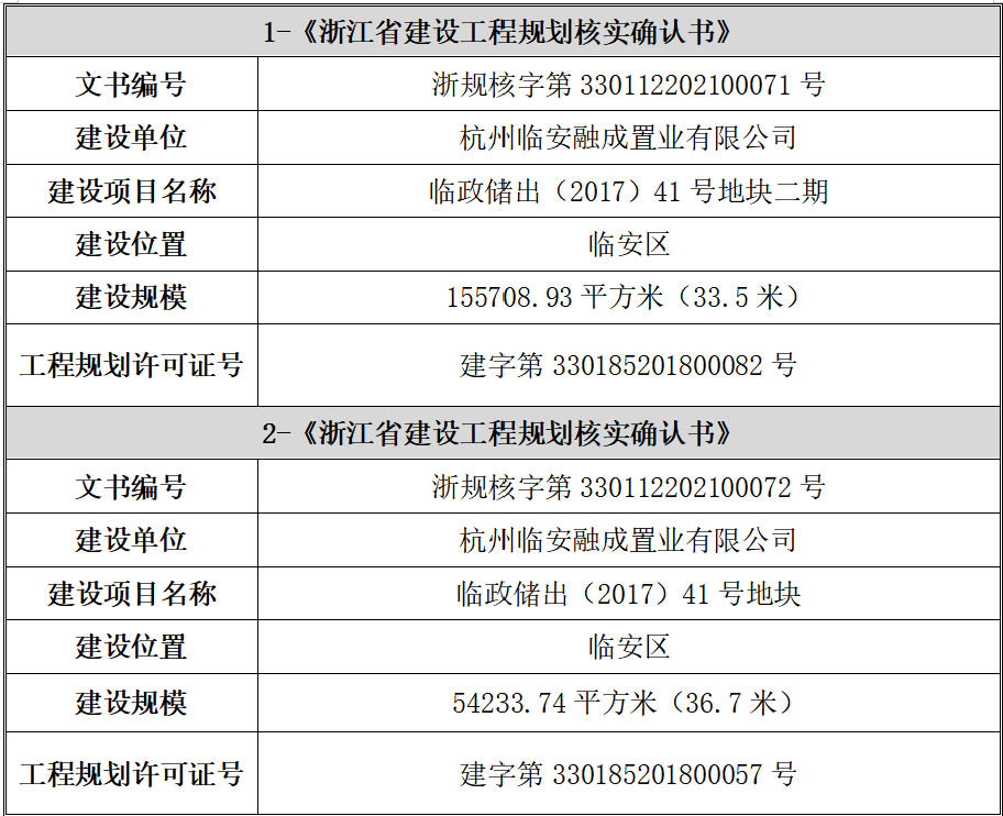 2018年8月30日,融成公司取得杭州市临安区住房和城乡建设局核发2项建筑工程施工许可,具体信息如下: