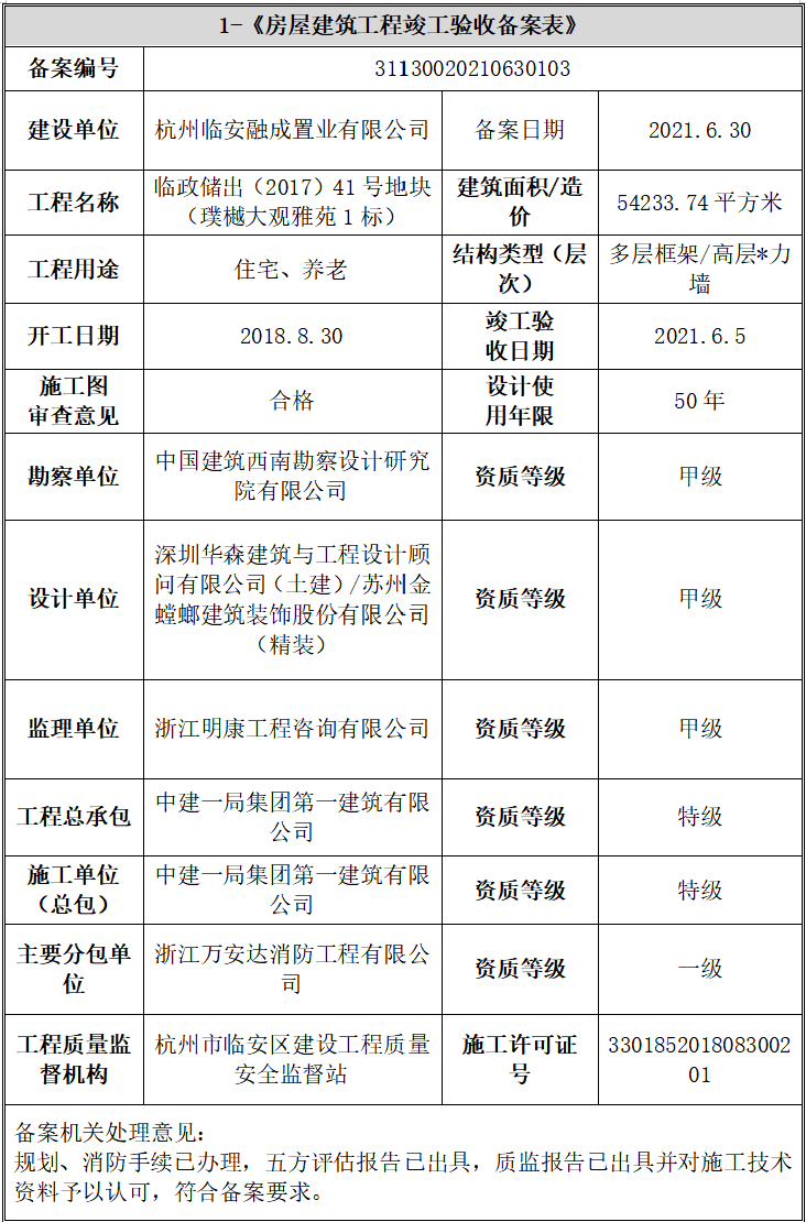 2021年6月30日,经杭州市临安区住房和城乡建设局审批通过,融成公司分别取得编号为31130020210630103号、31130020210630104号《房屋建筑工程竣工验收备案表》,具体信息如下: