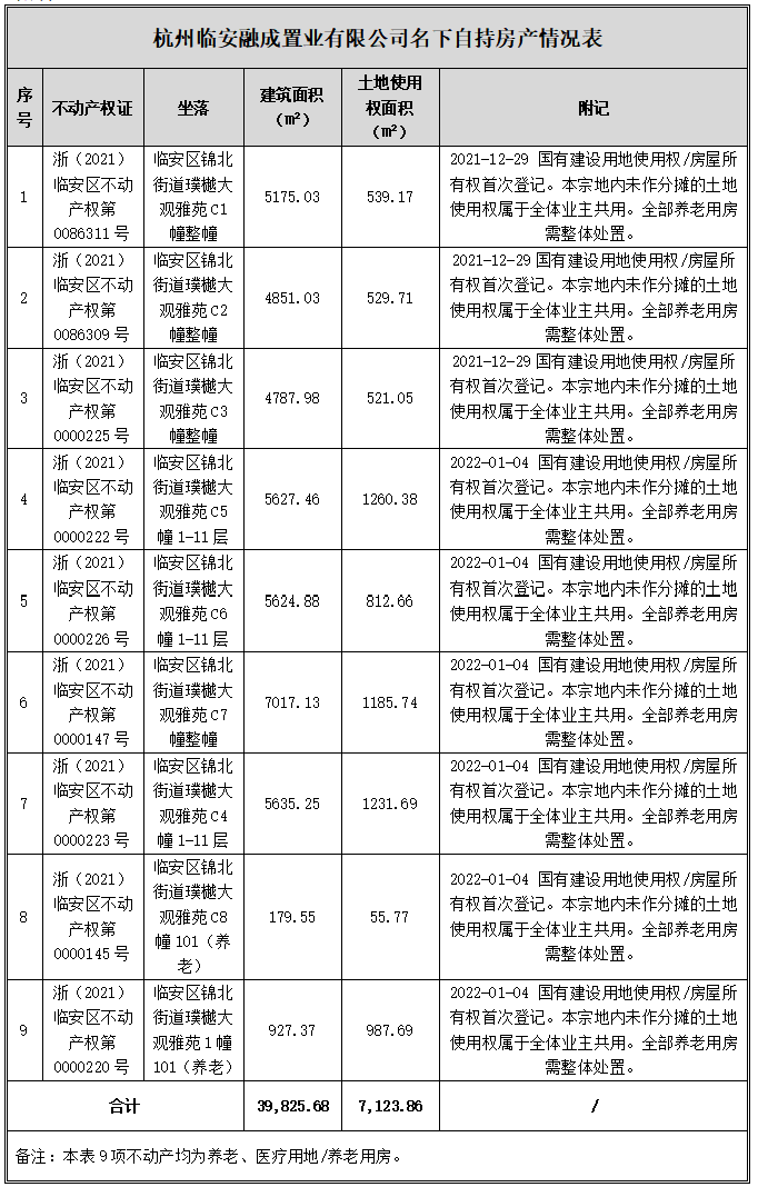 根据管理人向杭州市自然资源和规划局申请调取的房屋信息显示:截至2025年9月29日,融成公司名下共有58项不动产登记信息,包括45项城市住宅用地/住宅、4项城镇住宅用地/社区用房及9项养老、医疗用地/养老用房。根据管理人初步核查,45项市住宅用地/住宅中存在已出售并办理网签登记的情形(具体情况以最终管理人核查为准);4项城镇住宅用地/社区用房;9项养老、医疗用地/养老用房(详见附件《杭州临安融成置业有限公司名下自持房产情况表》)按照前述《出让合同》约定为融成公司自持房产。具体自持情况如下: